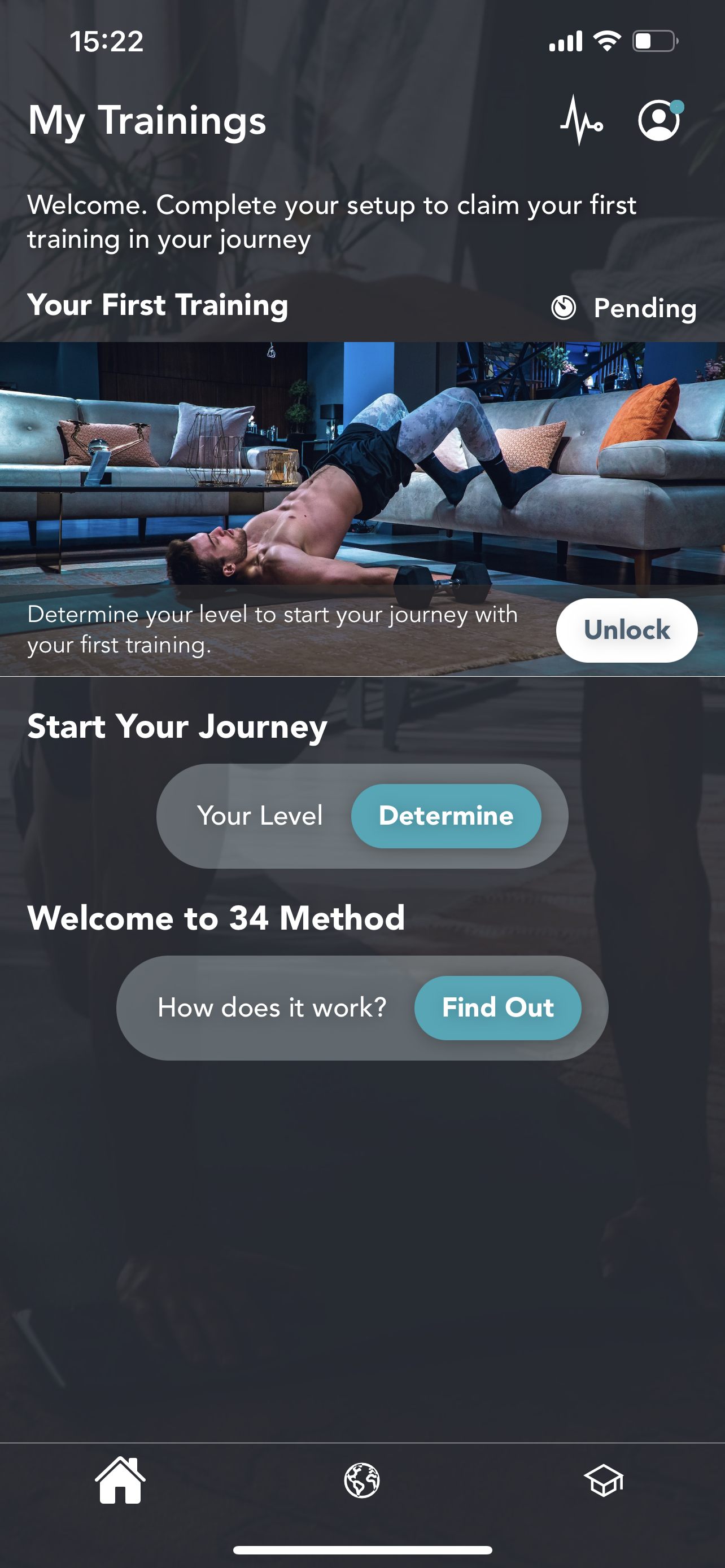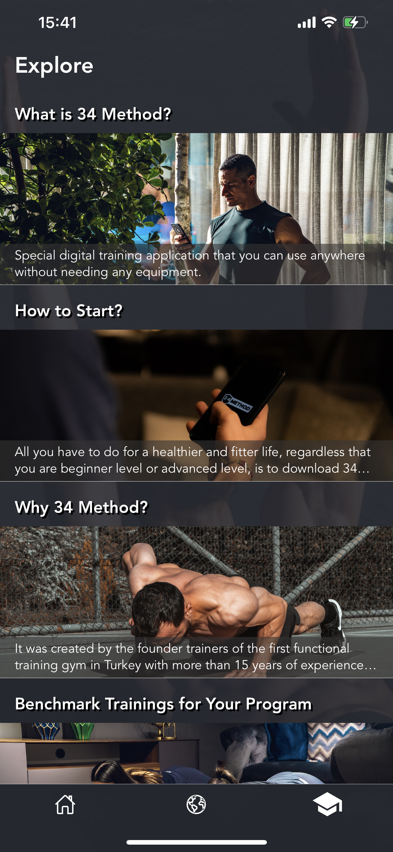 All you have to do for a healthier and fitter life, regardless that you are beginner level or advanced level, is to download 34 Method application. 34 Method will guide you in every step on your journey to your goal with trainings that suit every level. After downloading the application, complete the benchmark training, determine your level and pick your training days. Hit Start button, get to your special trainings and start the change.